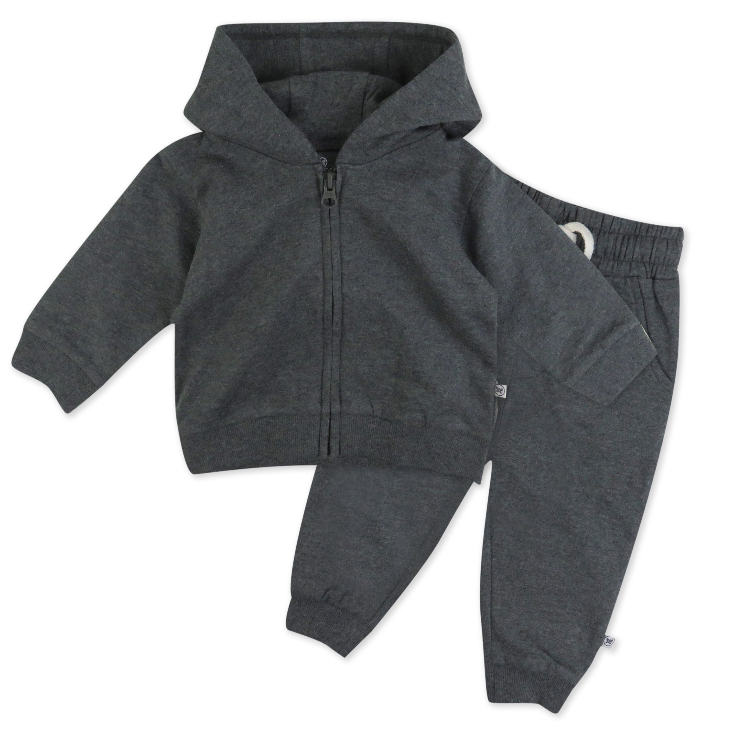 This easy 2-piece sweatsuit set is super cozy for everyday play. This outfit is crafted from 100% certified organic cotton and thoughtfully designed to make dressing easier for parents and more comfortable for kids. The 2-piece set features a zip-front hooded sweatshirt and sweatpants with drawstring and a comfy waistband. The perfect outfit to keep kids cozy and cute all season long and makes a great gift too.