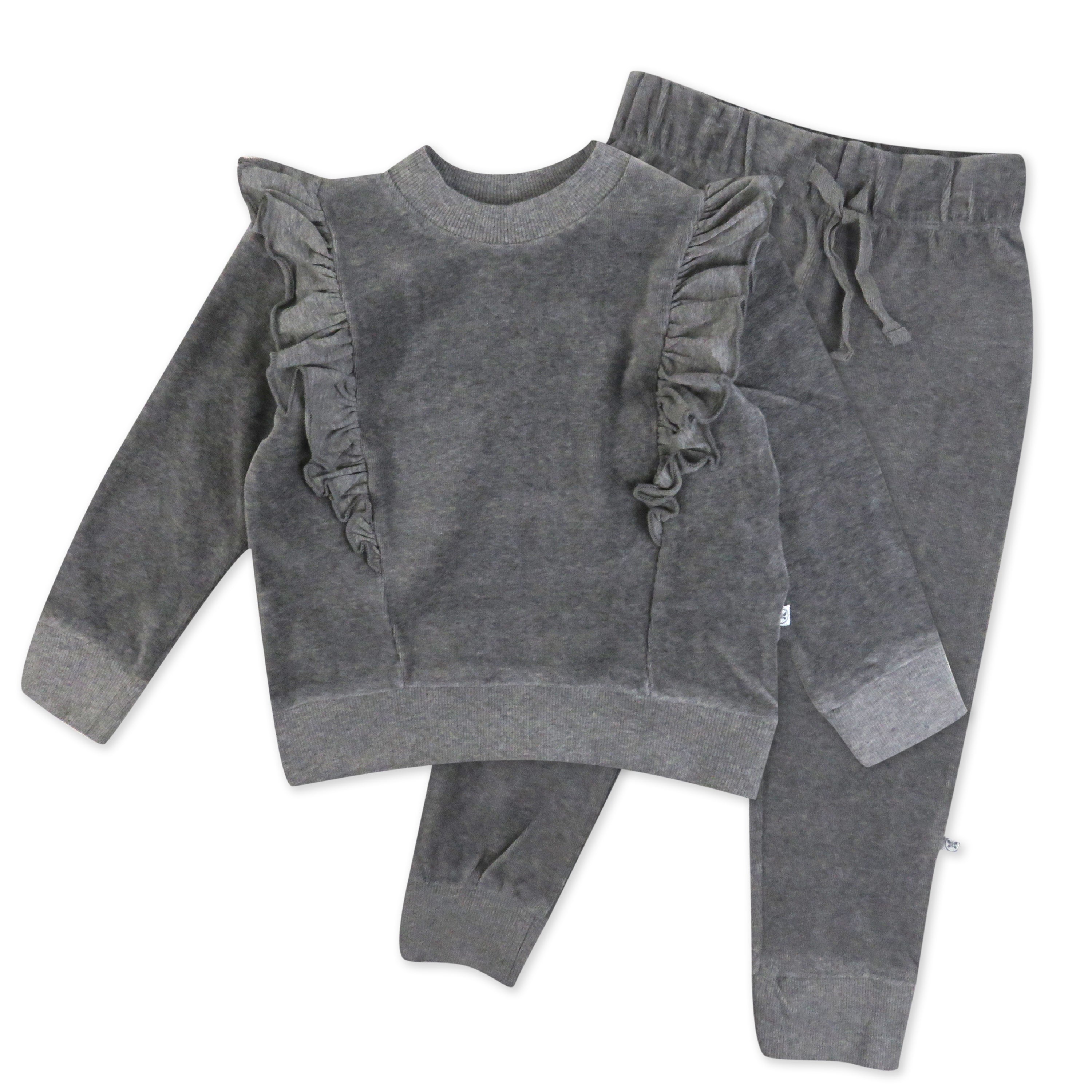 This adorable 2-piece velour sweatsuit combines super-soft organic cotton with adorable ruffle details for a playful look. Perfect for keeping your little one comfy and cozy, it's the perfect blend of comfort and cuteness.