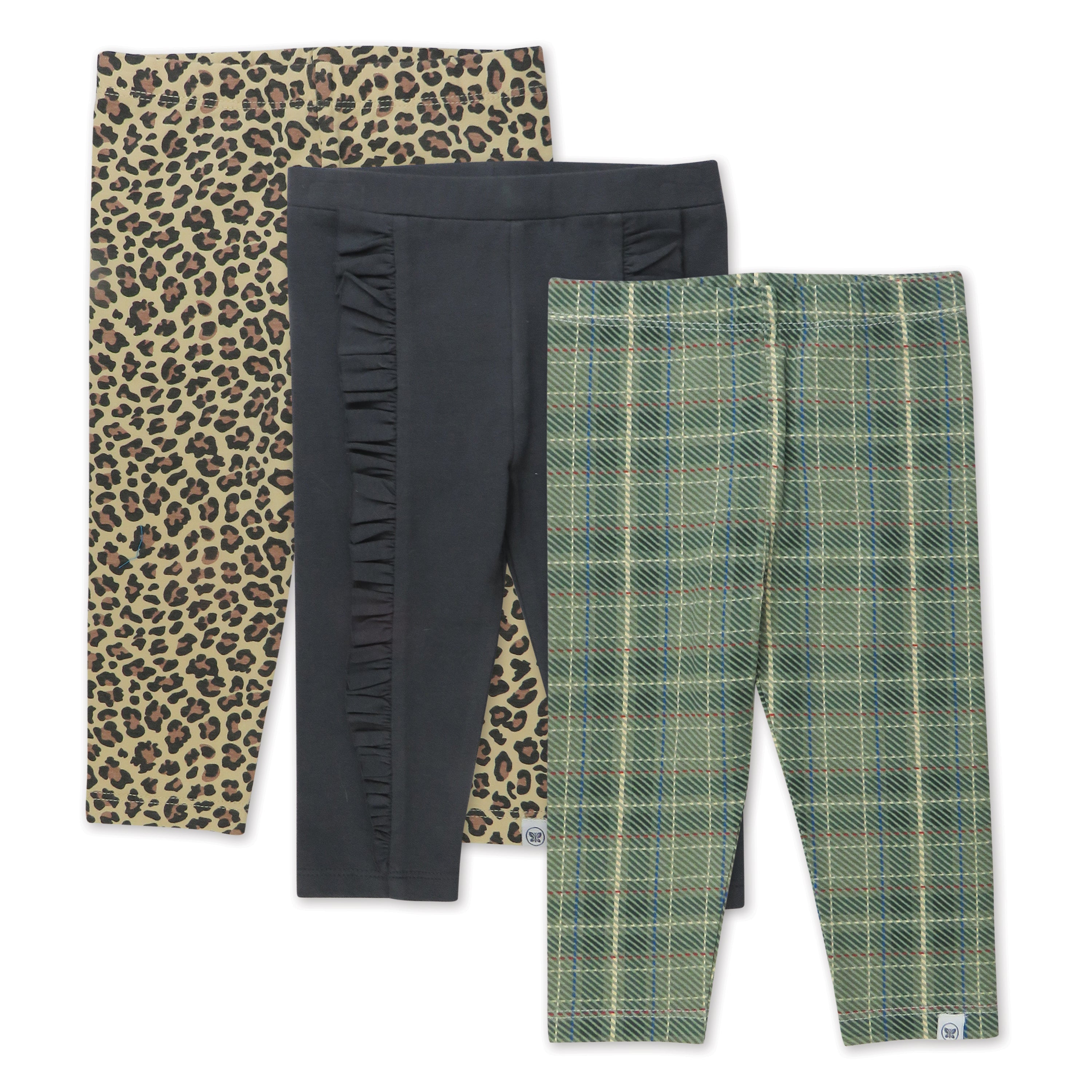 Leggings are must-haves for every little girl and that's why we made a 3-pack of mix + match prints and colors. This pack features three comfy-fit bottoms and one of the leggings has ruffles down the front for a super cute look. The easy pull-on design makes it easier to get dressed and changes a breeze. Made from organic cotton (with elastane for stretch), these pants are sure to be a go-to for any playtime outfit. Pair with our comfy tees and kiddo is ready to go!