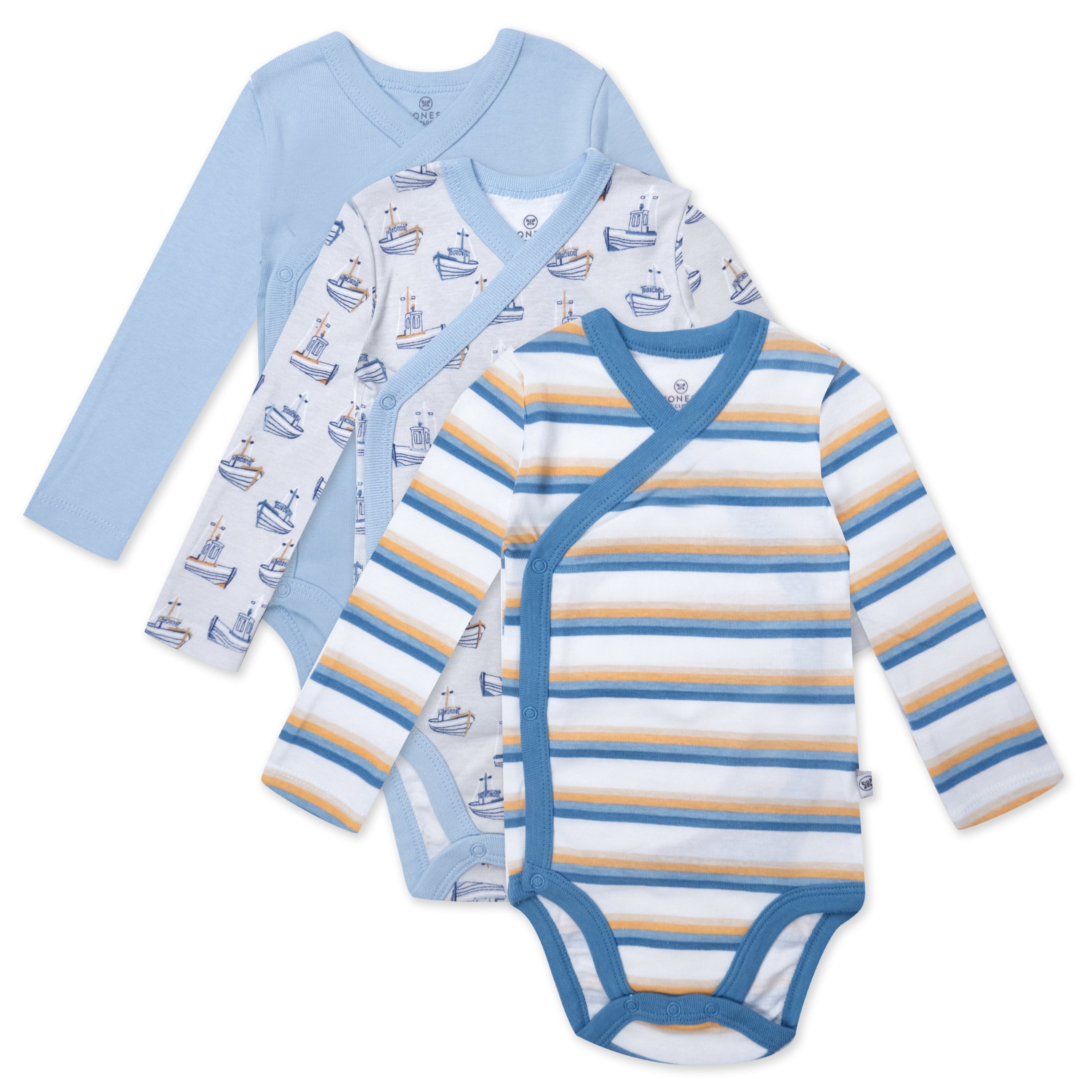 Our clever side-snap bodysuits are super functional. Crafted from soft, breathable 100% organic cotton, this bodysuit features a comfy wrap closure and side snaps, allowing for quick diaper changes. Available in a 3-pack, this soft bodysuit has long sleeves with convenient fold-over cuffs to protect baby from little fingernail scratches. Wrap your baby in luxe style with friendly features you will love.