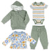 - 4-Piece set: Long sleeve shirt, short sleeve bodysuit, hooded zip-up sweatshirt and sweatpants