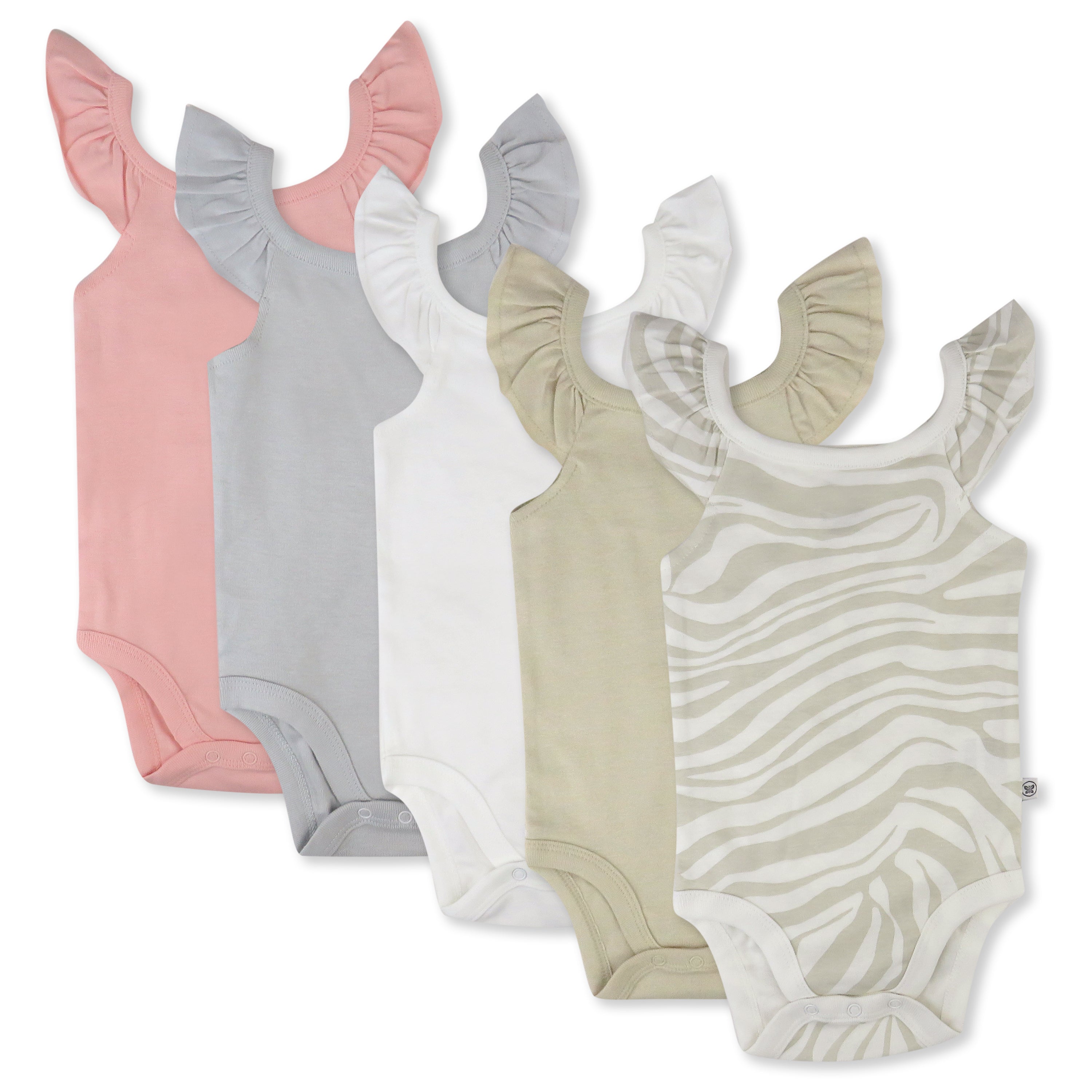 Bodysuits are must-haves for babies and these stylish tank bodysuits with ruffle details create the cutest looks. Available in a convenient 5-pack, these soft bodysuits keep baby comfy and cozy all day long. Nickel-free snaps at the bottom make dressing easier and changes quick. Made from 100% organic cotton, this sleeveless bodysuit is just right to wear on its own or layered for super-cute styles.