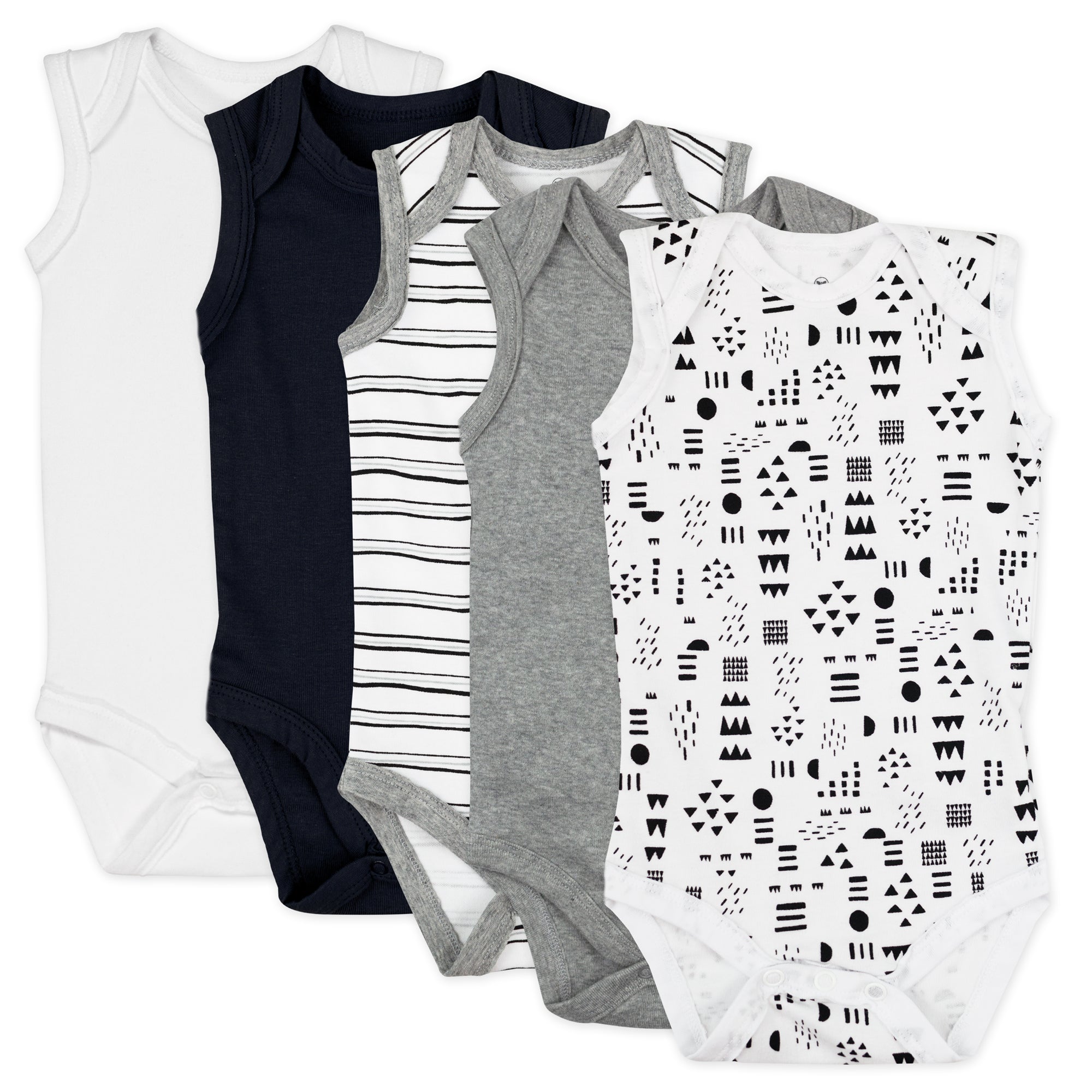 Sleeveless bodysuits are must-haves for babies. Available in a convenient 5-pack, our soft bodysuit keep baby comfy and cozy all day long. An envelope neck that expands and nickel-free snaps at the bottom make dressing easier and changes quick. Made from 100% organic cotton, this sleeveless bodysuit is just right to wear on its own or layered for super-cute styles.
