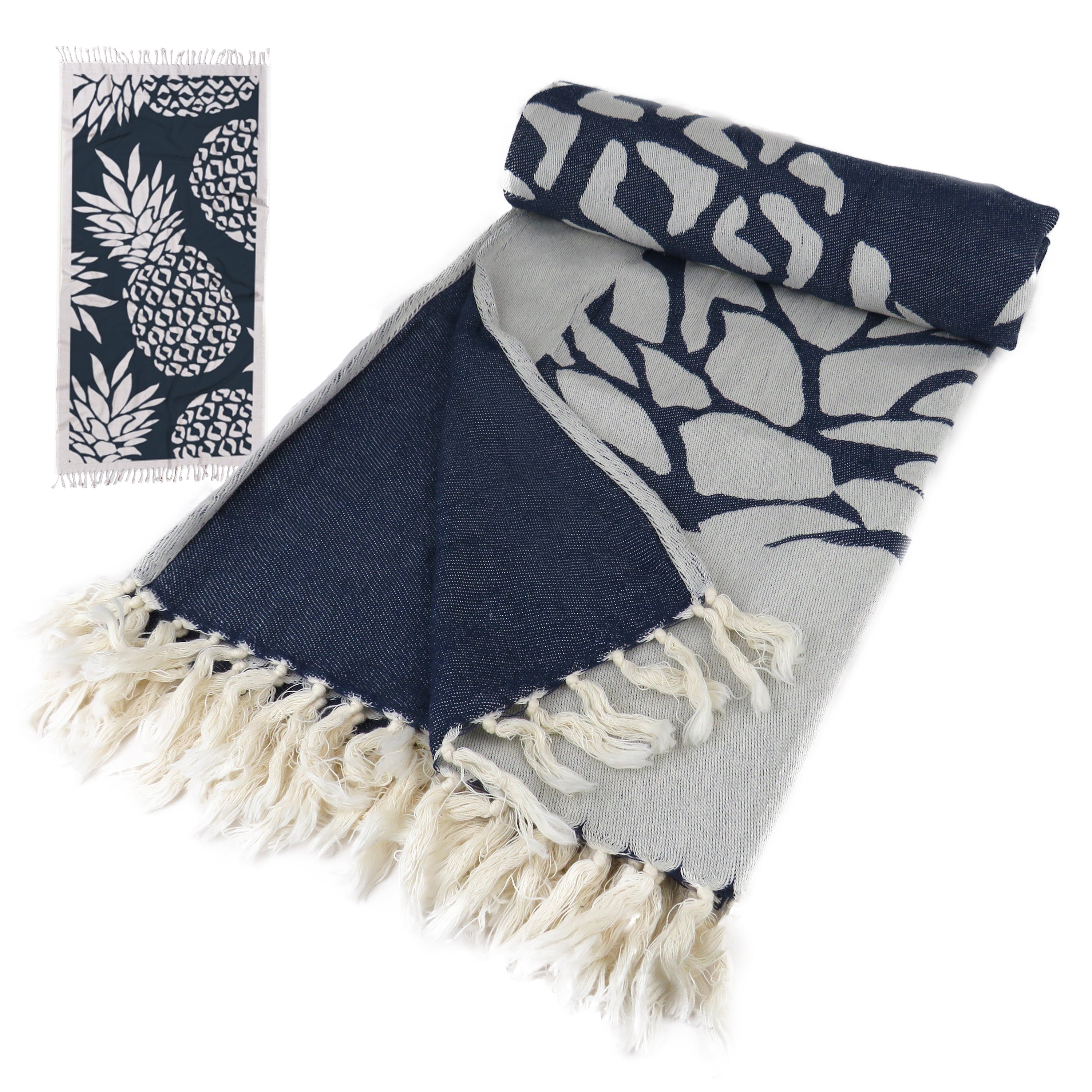 These luxurious Turkish beach towels are also lightweight throws or picnic blankets. Crafted from super-soft 100% organic cotton, this towel is a must-have for summer. The beautiful design is reversible and has fringe details on both ends. Perfect for the beach, this fabric shakes sand off with ease and dries quickly. The large size makes it versatile for the beach to cozy up at home and can also be worn as a scarf. The matching little tote bag with rope handles is made for travel - just roll up your blanket and go! Available in safari-inspired colors and designs, this towel makes a great gift too.