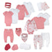 - 20-piece baby gift set includes newborn size baby clothes and accessories made from soft 100% certified organic cotton in sketchy floral pink
