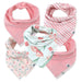 These reversible bandana bibs are perfect for babies when things get a little messy. Keep your baby clean and dry with these 2-in-1 bandana bibs made of 100% organic cotton. Each bib is reversible and paired with a fun color or print so you get two cute looks in one bib. This convenient style can be used as a burp cloth when flat and it converts to a bib with adjustable snaps at the corners. Not just for feeding, these bibs are great for droolers and make a cute accessory for any outfit. Registry must-have - makes a great baby shower gift too!