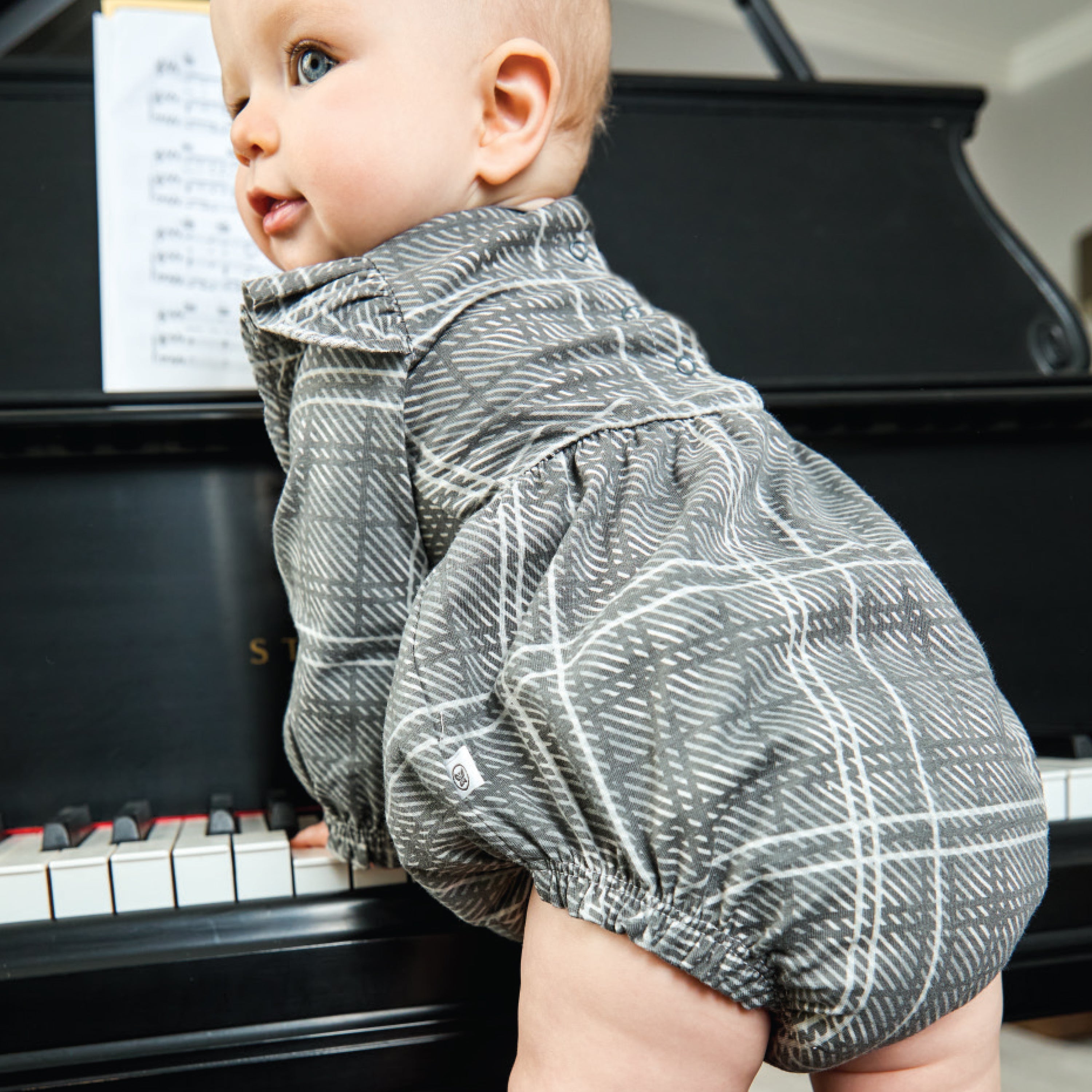 Our new bubble romper with long sleeves and ruffle details is the cutest look for Fall. This stylish one-piece outfit is comfy and cozy for baby and easy for parents. Responsibly made from machine washable 100% certified organic cotton, this romper features nickel free snaps on the back and the bottom for easy dressing and quick changes. Top off this adorable look with our comfy-fit knotted headband (with elastane for stretch). Available in adorable prints and colors, you'll want more than one. Makes a great baby gift too!