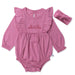 This bubble romper with ruffles at the shoulders is the cutest look for spring. This stylish one-piece outfit is comfy and cool for baby and easy for parents. Responsibly made from machine washable 100% organic cotton, this romper features nickel free snaps for easy dressing and quick changes. Top off this adorable look with our comfy-fit knotted headband. Available in adorable prints and colors, you'll want more than one. Makes a great baby gift too!