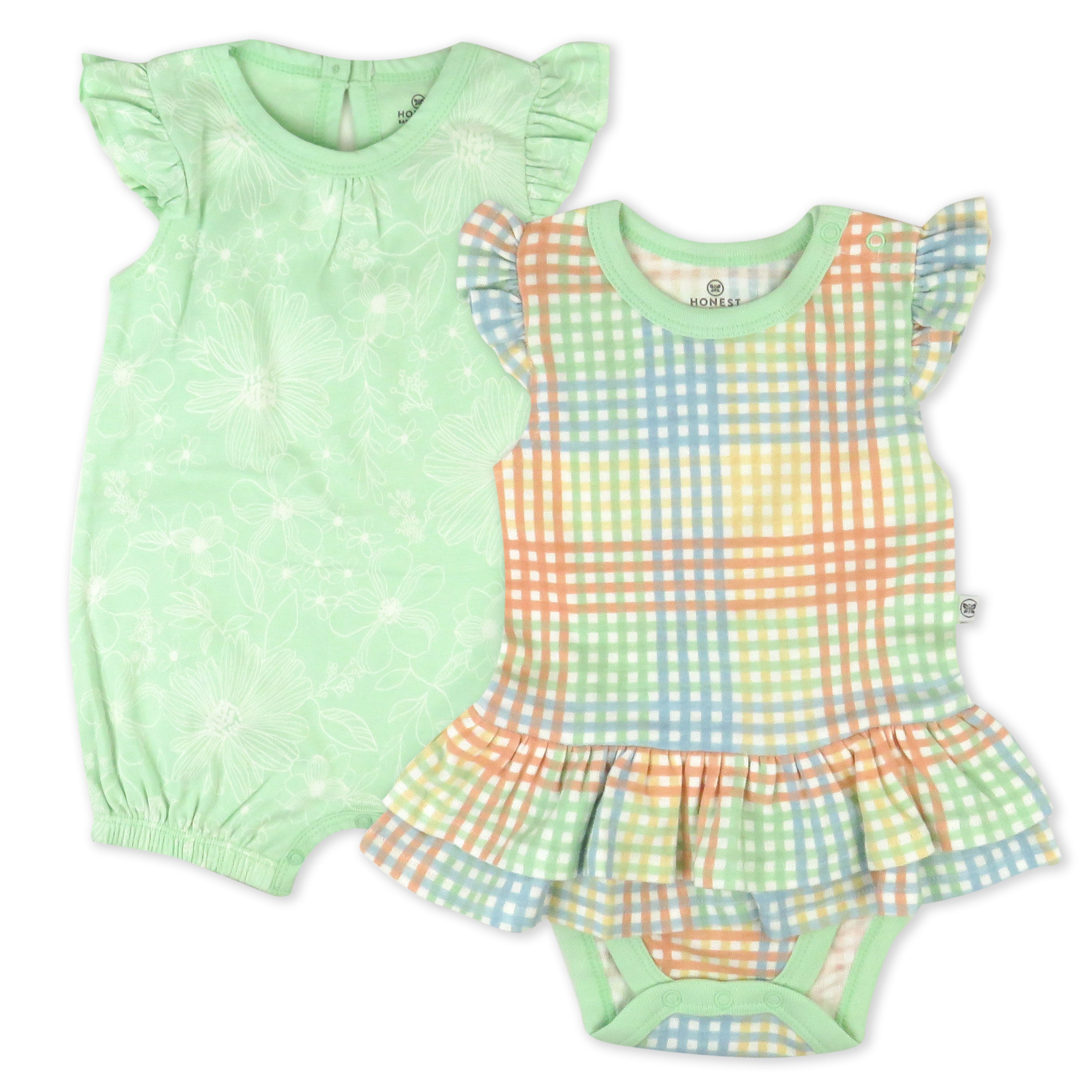Stay adorable and cool in this one-piece romper and bodysuit dress set. Crafted from premium organic cotton, the romper has ruffle sleeves and snaps at the legs for easy dressing. The bodysuit dress has a stylish ruffle that goes all the way around and snaps for quick changes. Easy breezy and super-cute!