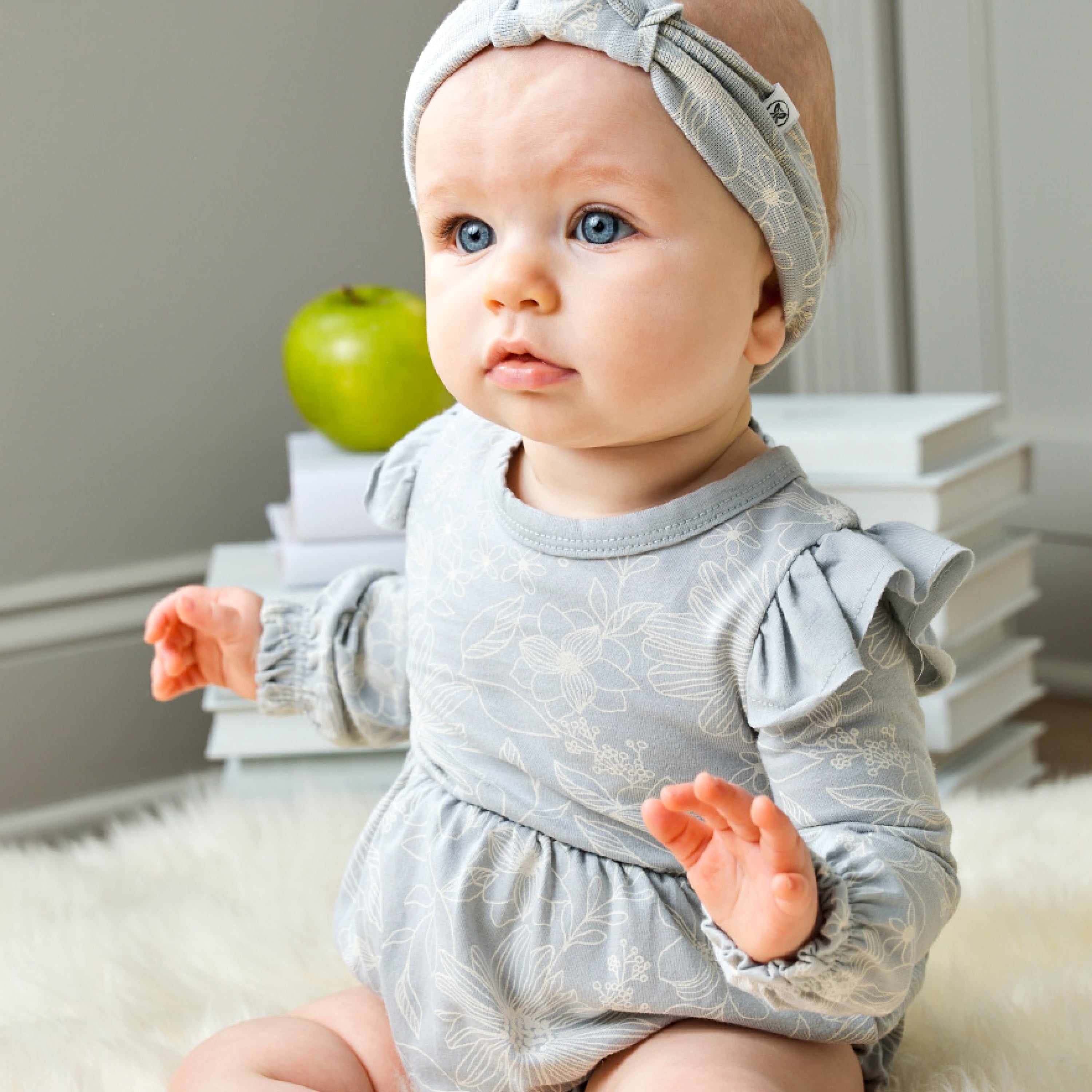 Our new bubble romper with long sleeves and ruffle details is the cutest look for Fall. This stylish one-piece outfit is comfy and cozy for baby and easy for parents. Responsibly made from machine washable 100% certified organic cotton, this romper features nickel free snaps on the back and the bottom for easy dressing and quick changes. Top off this adorable look with our comfy-fit knotted headband (with elastane for stretch). Available in adorable prints and colors, you'll want more than one. Makes a great baby gift too!