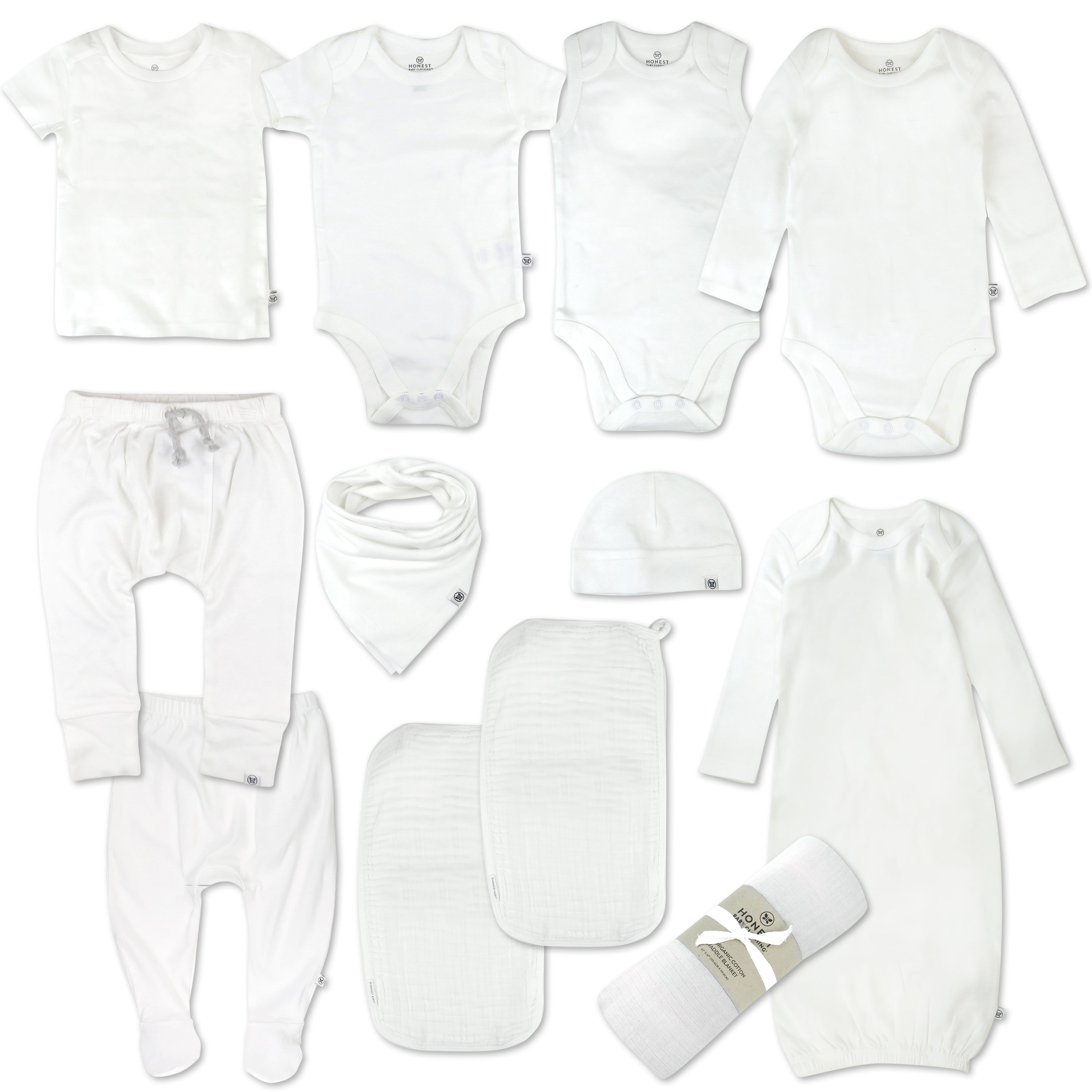 This 12-Piece Welcome Home gift set is crafted from 100% organic cotton, certified by GOTS and is just right for a new baby. This beautiful gift includes super-comfy tops and pants for endless outfits. Two soft burp cloths and a bib are just right for when things get a little messy. Add a dip-dyed swaddle blanket for extra snuggles and top off these adorable looks with a baby beanie. This gift set is beautifully packed in a craft gift box with a ribbon. Gift-giving made easy!