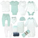 • 12-piece gift set includes: Sleeper Gown, Sleeveless Bodysuit, Short Sleeve Bodysuit, Long Sleeve Bodysuit, Short Sleeve T-Shirt, Footed Pant, Honest Pant, Beanie, Bandana Bib, Swaddle Blanket and 2 Woven Burp Cloths